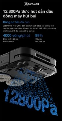 Được trang bị công suất hút lên đến 12.800Pa, robot hút bụi Deebot X5 Pro Omni sức hút cực lớn để làm sạch sâu mọi bề mặt , từ sàn cứng đến thảm. Robot hút bụi Ecovacs sử dụng động cơ tốc độ cao, thiết kế ống dẫn thẳng, nhằm đạt hiệu quả tối đa trong việc loại bỏ bụi bẩn mà không để lại bất kỳ dấu vết nào.