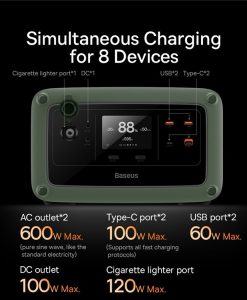 Sạc dự phòng Baseus Power Station 600W được trang bị tới 8 cổng sạc đầu ra, là 2 cổng AC sạc tường, 2 cổng sạc Type C, 2 cổng USB, 1 điểm sạc trên ô tô và 1 cổng DC. Nó có thể sạc cho 8 thiết bị cùng lúc và khá đầy đủ để đáp ứng các nhu cầu năng lượng cơ bản của bạn.