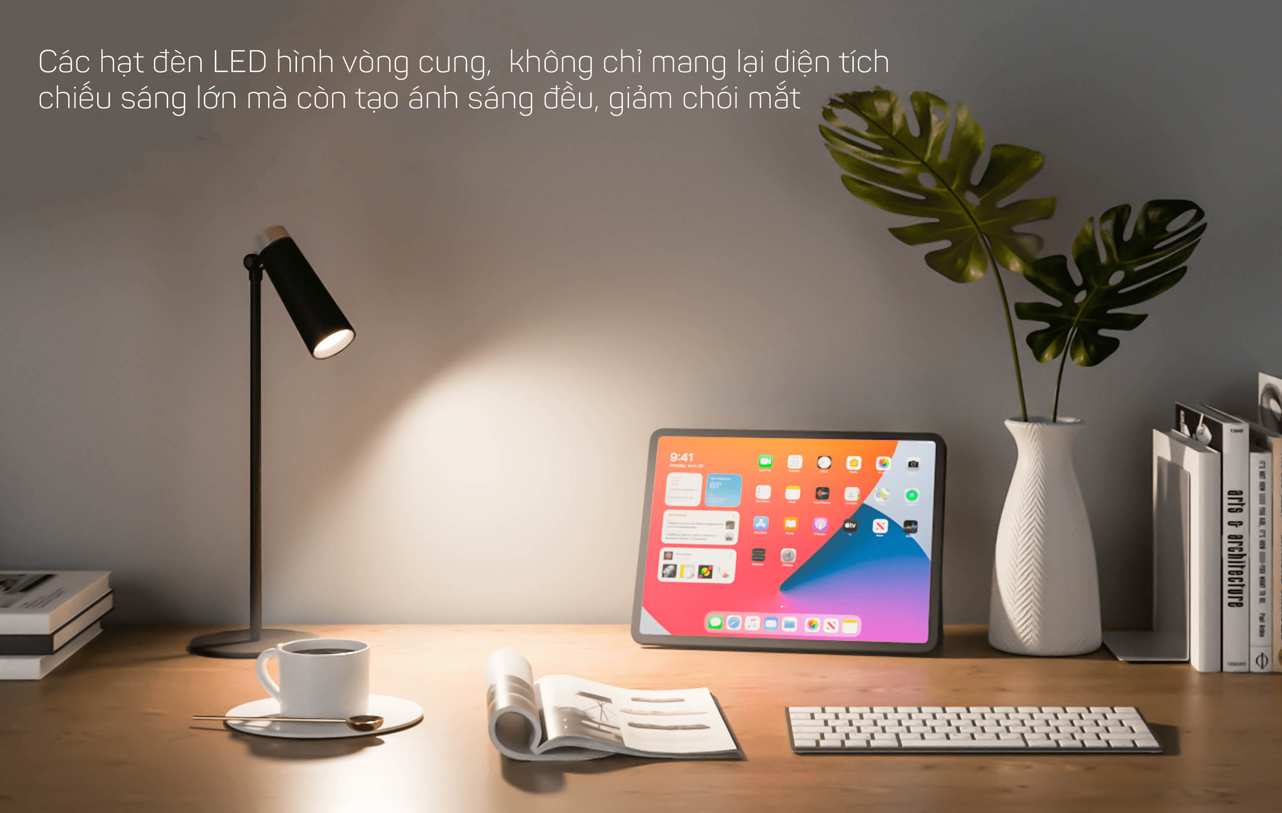 Khi kết hợp với đế đứng, bạn có thể sử dụng như một chiếc đèn bàn truyền thống. Thiết kế không dây nhỏ gọn, không tốn nhiều diện tích, đảm bảo độ sáng cho việc đọc sách, làm việc,…
