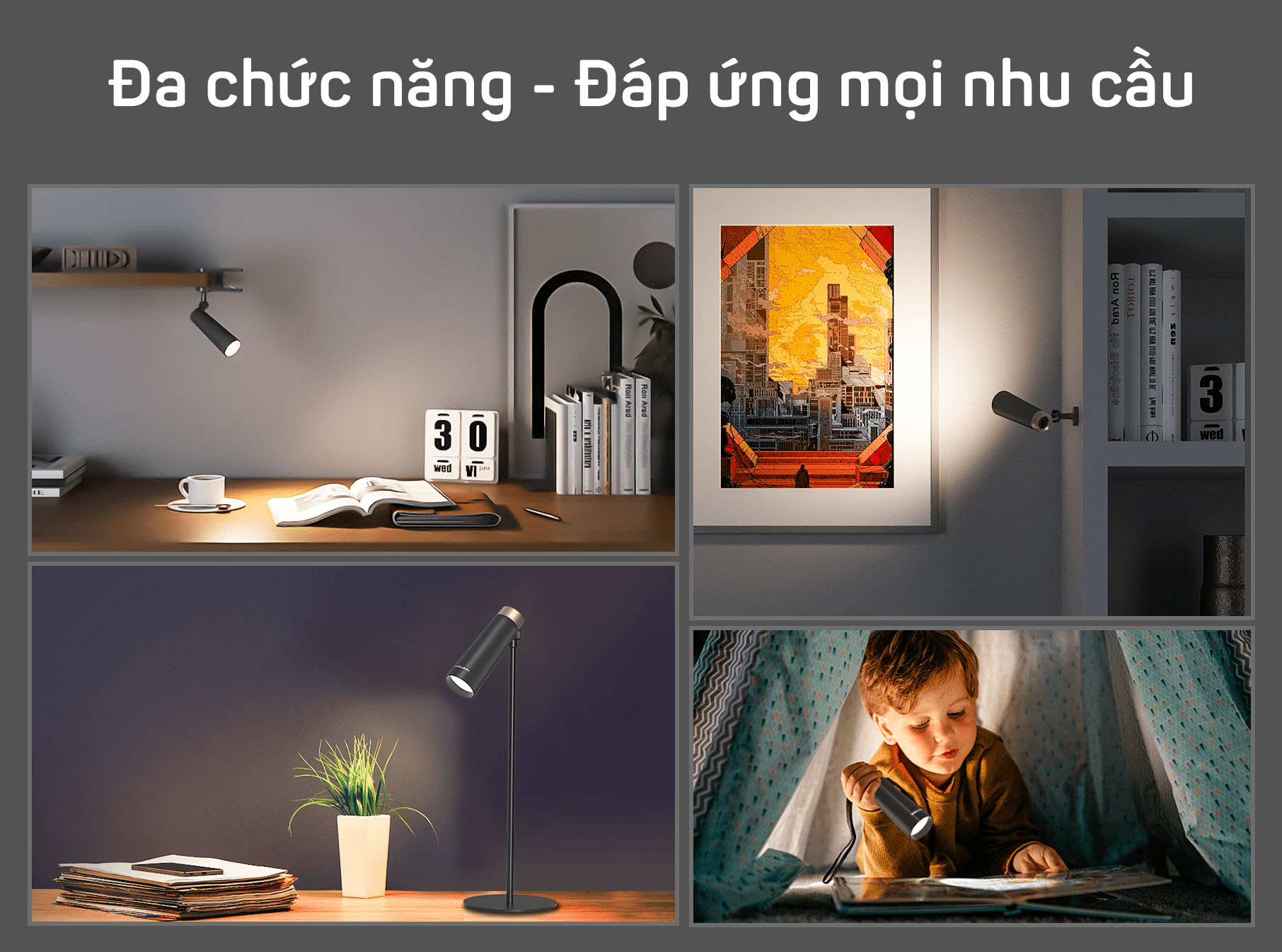Chân đế kẹp và nam châm phù hợp cho những vị trí trên cao, như giá sách, kệ đồ,… khu vực hành lang hoặc góc làm việc có diện tích nhỏ. Nếu sử dụng độc lập, bạn có thể sử dụng như một chiếc đèn pin cầm tay cho các hoạt động ngoài trời, không gian nhỏ,….