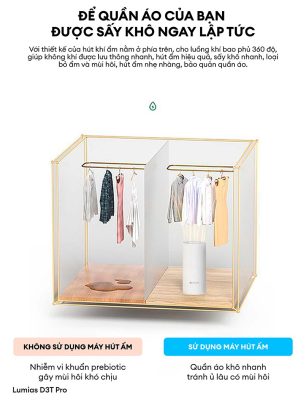 Máy hút ẩm thông minh Lumias D3T Pro được thiết kế thêm lỗ thoát khí trên cùng kết hợp luồng khí 360 độ loại bỏ độ ẩm trong không khí, giúp quần áo khô nhanh hơn.