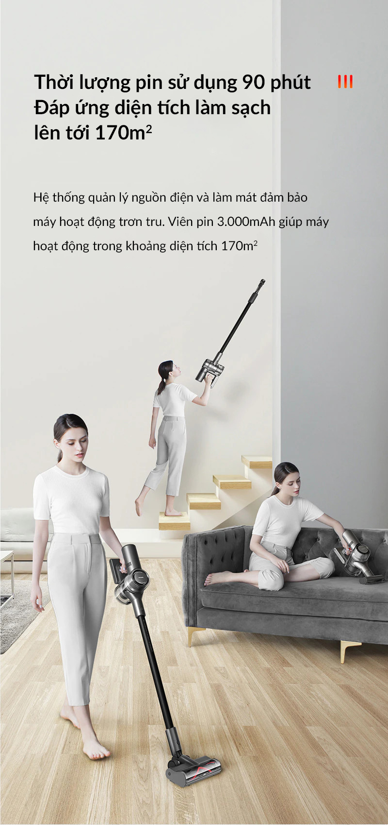 Thời gian sử dụng lên tới 90 phút dễ dàng làm sạch ngôi nhà diện tích 170 mét vuông