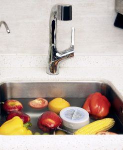 Thiết bị được ứng dụng công nghệ khử khuẩn hiện đại, sử dụng công nghệ tinh lọc ion để khử khuẩn thực phẩm, nói không với hóa chất. Nước sẽ bị phân hủy thành OH- và H+ bởi máy ion hóa. Phần OH- trong nước sẽ lấy đi H+ trong thuốc trừ sâu và thành tế bào vi khuẩn để tạo thành phản ứng hóa học biến chúng thành những chất không còn độc hại. Phần còn lại của OH- sẽ kết hợp với Clo có trong nước để tạo thành HClO có tính khử trùng tiêu diệt vi khuẩn.