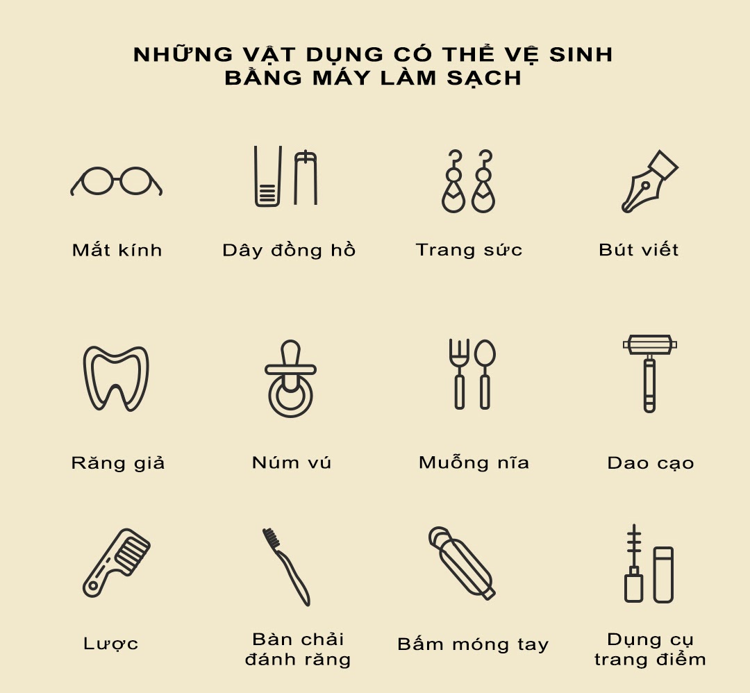 Lưu ý: Sóng siêu âm không thích hợp để làm sạch ngọc trai và đồ trang sức bằng vỏ rùa có độ cứng thấp, khung gương bằng kim loại hàn, kim loại mạ điện và chất kết dính kim loại, thân đồng hồ và các đồ vật khác dễ bị hỏng trong quá trình làm sạch. Vì vậy, trước khi làm sạch các vật có giá trị, vui lòng tham khảo ý kiến của người bán sản phẩm để xác nhận xem có thể vệ sinh bằng máy làm sạch hay không.