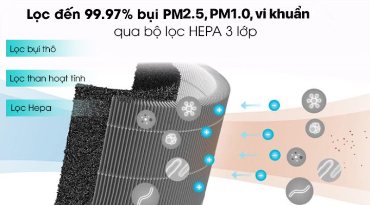 – Màng lọc Hepa: Có khả năng giữ được các hạt bụi có kích thước nhỏ đến 0.3 micromet (khoảng bằng 0.0025 đường kính 1 sợi tóc), trong đó có cả bụi mịn PM1.0 và PM2.5 – loại bụi nguy hại đến tim và não người, thường có trong khí thải của phương tiện giao thông, khói thải công nghiệp…