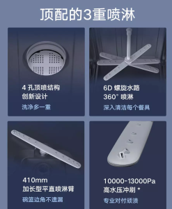 Máy rửa bát AI Xiaomi Mijia 8 bộ sử dụng hệ thống dẫn nước xoắn ốc 6D 3 lớp được trang bị cao giúp làm sạch vết bẩn hiệu quả. Trên 8 bộ tay phun của máy rửa chén, cấu trúc phun trên cùng dành riêng cho các mẫu cao cấp được cấu hình và nhiều góc thoát nước khác nhau được thiết kế trong mỗi 4 mảnh với 25 lỗ thoát nước, tạo thành một mạng lưới 360° đan xen, đường nước bao phủ các món ăn trong khoang theo mọi hướng và làm sạch bát dĩa hoàn toàn sau khi rửa.