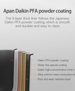 Phần nồi được hãng phủ lên một lớp sơn chống dính Daikin PFA – Công nghệ hàng đầu tại Nhật Bản đảm bảo không làm ảnh hưởng đến chất lượng đồ ăn. Khả năng chống dính tốt mang lại sự an tâm cho người dùng cũng như dễ dàng trong công việc vê sinh.