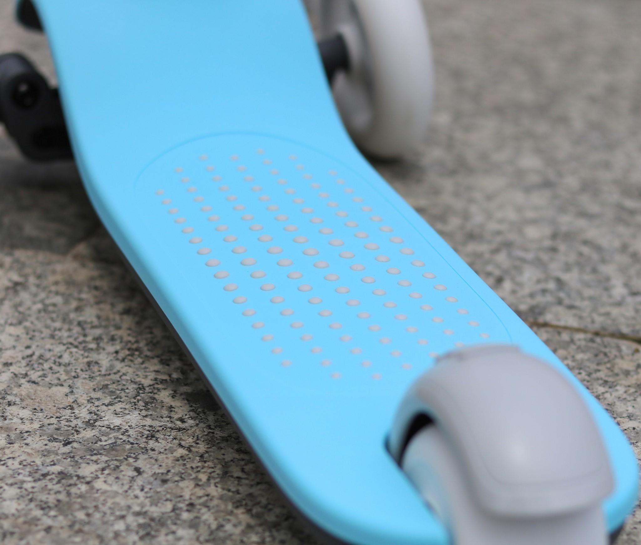 Trong khi đó, bàn đạp của chiếc xe trượt MITU lại được thiết kế phần diện tích tiếp xúc với chân người dùng khá lớn lên đến 274cm2. Diện tích này sẽ cho phép trẻ thoải mái đặt được 2 chân lên xe mà không sợ té và tăng khả năng chịu lực của xe lên đến 50kg. Ở chính giữa bàn đạp là thiết kế 129 điểm chống trượt TPR có tác dụng bảo vệ an toàn tuyệt đối cho trẻ khi sử dụng.